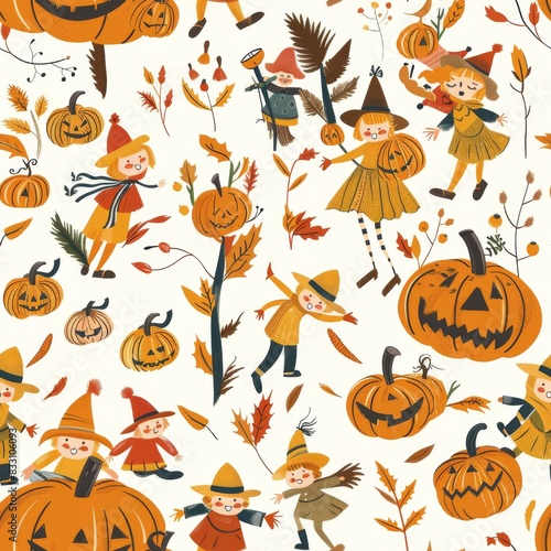 Fototapeta premium seamless pattern of vibrant pumpkin patch with happy children playing