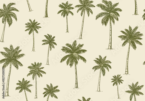 © stock.metket.com, Fototapeta premium Seamless pattern of vintage hand drawn coconut palm tree sketch on light beige background for tropical textile design