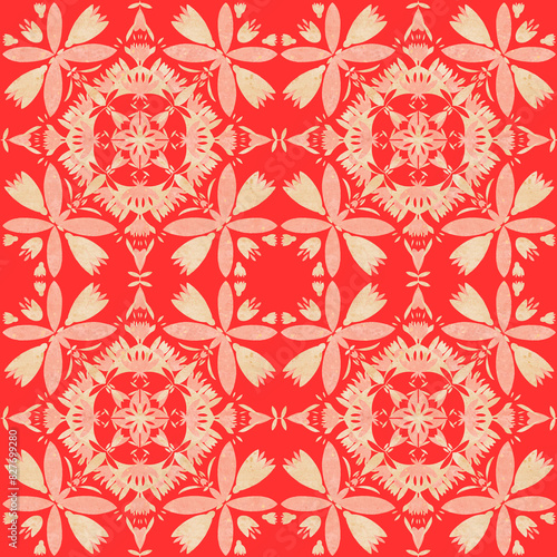 © Grin Katalin, Fototapeta premium seamless pattern of watercolor illustration in the style of Portuguese tiles illustration of azulejos in boho style, abstract orange on a white red background floral motifs