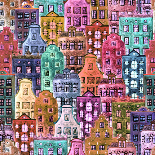 © Olga, Obraz premium Seamless pattern of watercolor old europe houses