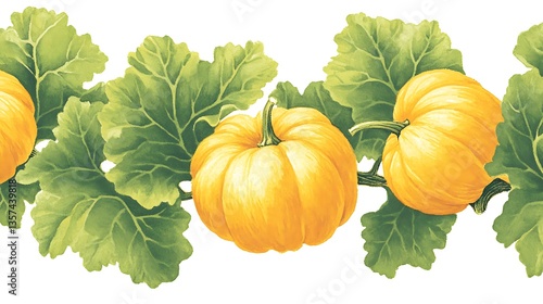 © Mul, Obraz premium Seamless pattern of yellow pumpkins and green leaves.