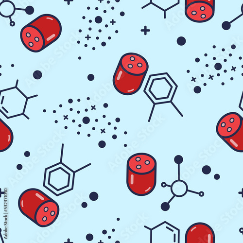 Fototapeta premium Seamless pattern on theme of fake meat grown in laboratory. Sausages and chemical elements on blue background.