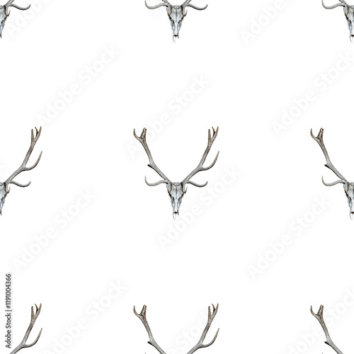 © Іванна Поліщук, Naklejka premium Seamless pattern Red deer Elk old skulls Background for Halloween design Scull wrapping paper Wallpaper cloth fabric web design Scary party template