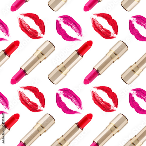 © Vera Shestak, Obraz premium Seamless pattern red kiss print and golden lipstick on white background isolated, open lipsticks and sexy pink lips makeup stamp repeating ornament, cosmetic wallpaper, beauty backdrop, fashion banner