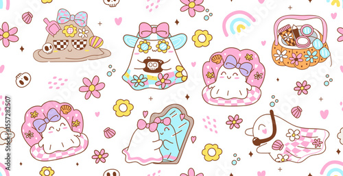 © sittha, Fototapeta premium Seamless pattern reto groovy little ghost in spooky summer. Vector illustration.