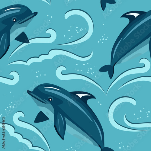 © Nataliia, Naklejka premium Seamless pattern sea, waves and dolphin