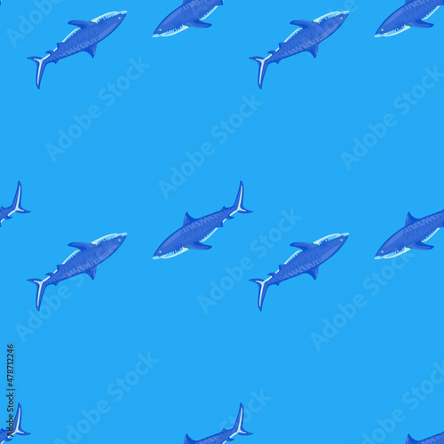 © Purple_Lamp, Obraz premium Seamless pattern Tiger shark bright blue background. Blue textured of marine fish for any purpose.