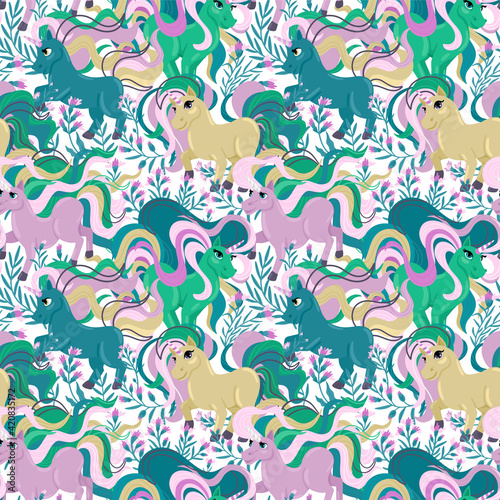 © Veronika, Fototapeta premium Seamless pattern unicorns. Childish girly design. Vector flat illustration. Design for paper, cover, fabric, interior decor and other users.