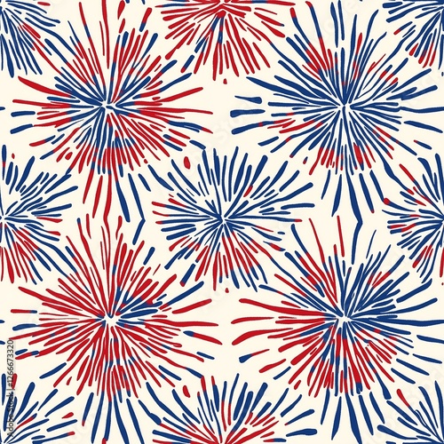 Fototapeta premium Seamless Pattern Vibrant pattern featuring red and blue fireworks on a light...