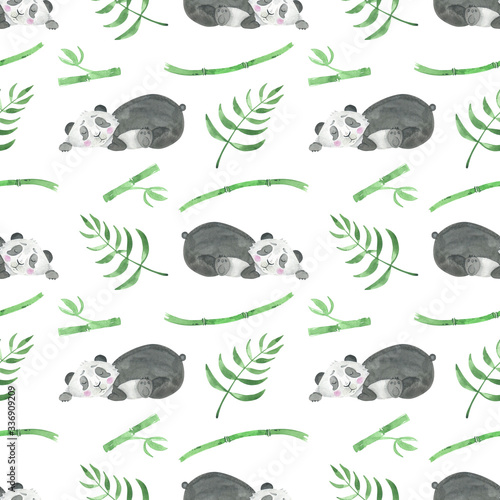 © Darya_s, Fototapeta premium Seamless pattern watercolor panda baby and bamboo background