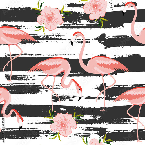 © ksenia_lokko, Naklejka premium Seamless pattern with a pink flamingo. Vector illustration.