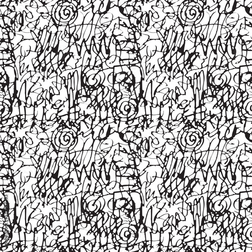 © paseven, Fototapeta premium Seamless pattern with abstract doodles in a graffiti style. Vector hand-drawn texture with black squiggles on a white background. Endless background, graphic print for clothes, wrapping paper or Wallp