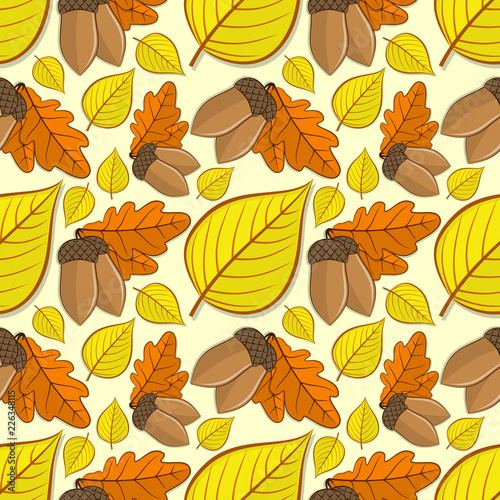 Obraz premium Seamless pattern with acorns and oak, linden autumn leaves. Vector illustration.