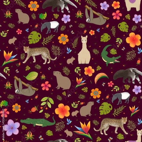 © Tais, Obraz premium Seamless pattern with animals of South America on dark background