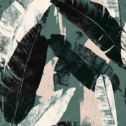 © Margarita Ratatosk, Fototapeta premium Seamless pattern with banana leave on a dark green background. Tropical botany elements for textile, wallpaper, and apparel. Leaf decoration for nature concept.