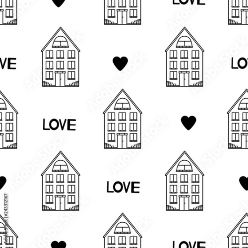 © Yana Zahoruiko, Fototapeta premium Seamless pattern with black houses, words Love and hearts.