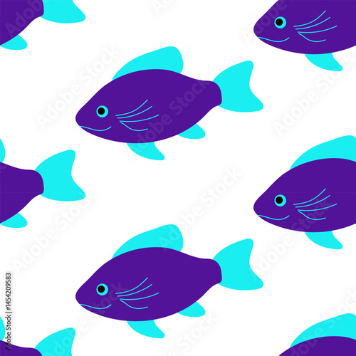© Elena, Fototapeta premium Seamless pattern with blue fish on a white background. Flat style. Design for wrapping paper, fabric, wallpaper. Vector illustration.