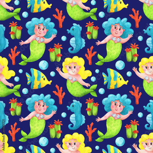 © Анна Сухова, Naklejka premium Seamless pattern with bright mermaids on a blue background. Watercolor children's ornament with fabulous sea characters. Print for summer fabric, beach textiles, paper, packaging