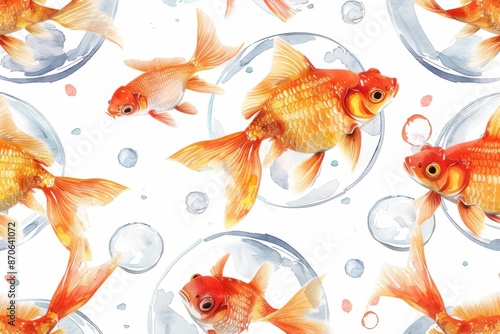 © Newstep, Naklejka premium Seamless pattern with bright orange goldfish swimming in clear water bubbles on white background. Watercolor illustration.
