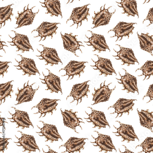 © Nadezhda, Fototapeta premium Seamless pattern with brown seashells. Hand drawn watercolor illustration of sea snails and shells on white background. Tropical clip art of coral reef animals for fabric, beach decor,wraping paper.