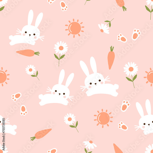 © Thanawat, Obraz premium Seamless pattern with bunny rabbit cartoons, sun, foot prints, carrot and daisy flower on pink background vector. Cute childish print.