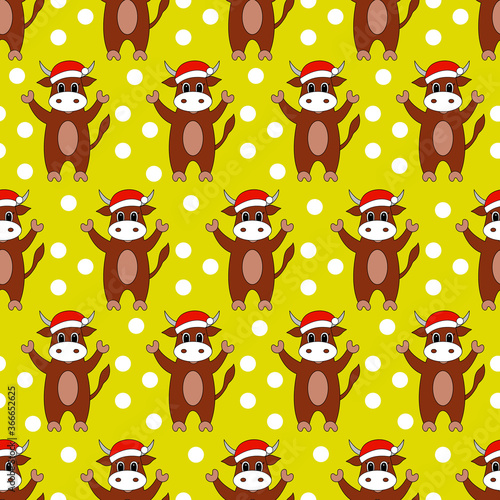 © YULIYA, Naklejka premium Seamless pattern with cartoon bull in santa hat. Vector illustration.