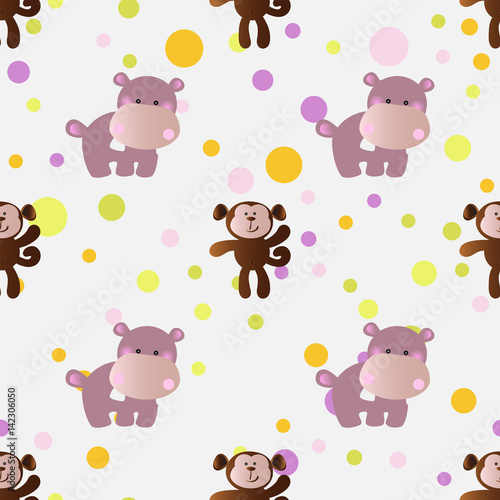 Obraz premium seamless pattern with cartoon cute toy baby behemoth, monkey and Circles on a light gray background