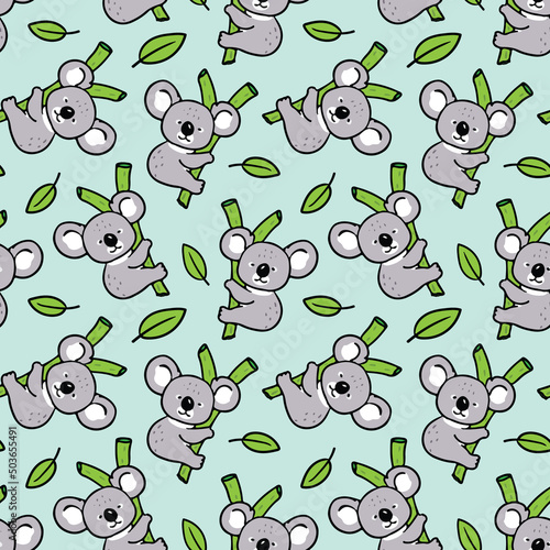 Obraz premium Seamless Pattern with Cartoon Koala Bear Design on Light Green Background