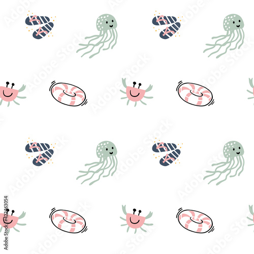Fototapeta premium Seamless pattern with cartoon sea objects and live animals. inflatable circle, flip-flops. Crab, jellyfish. Underwater background. Vector illustration.
