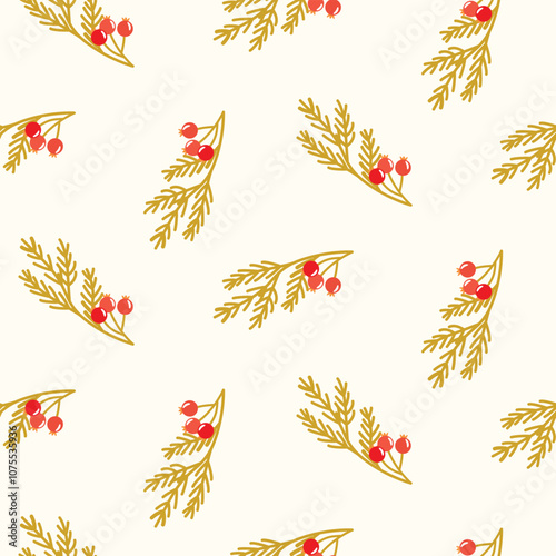 © Atelier Mokum, Fototapeta premium Seamless pattern with Christmas yew berry branches on isolated background. Hand drawn design for Winter, Christmas and New Year celebration, for paper crafts or home decor, holiday greetings.