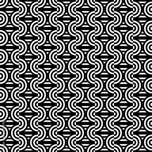 © Divin, Fototapeta premium Seamless pattern with circles and striped black white straight lines. Optical illusion effect. Geometric tile in op art style. Vector illusive background for cloth, textile, print, web.