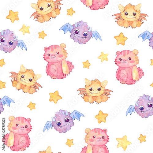 © OllyKo, Naklejka premium Seamless pattern with colorful, bright monsters, stars, isolated on a white background. Watercolor kids cartoon illustration. Hand drawn character.