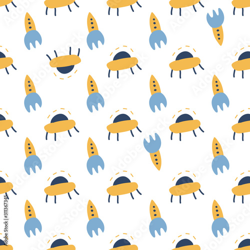 © Анастасия Красавина, Naklejka premium Seamless pattern with Cosmic objects. Vector illustration of Outer Space. Hand drawn doodle style.