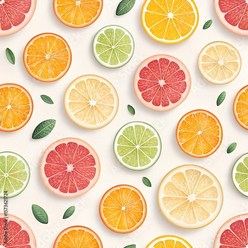 © Nataliya Selyutina, Obraz premium Seamless pattern with cut citrus fruits, soft shadows and 3D gradients, clean packaging design