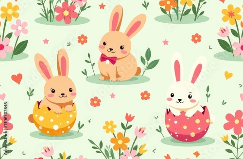 Obraz premium Seamless pattern with cute bunnies in Easter eggs and flowers. Perfect for...