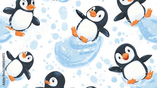 Fototapeta premium Seamless pattern with cute cartoon penguins sliding on ice.