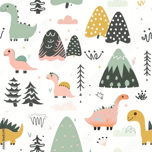 © Iswanto, Obraz premium Seamless Pattern With Cute Dinosaurs, Trees and Mountains.