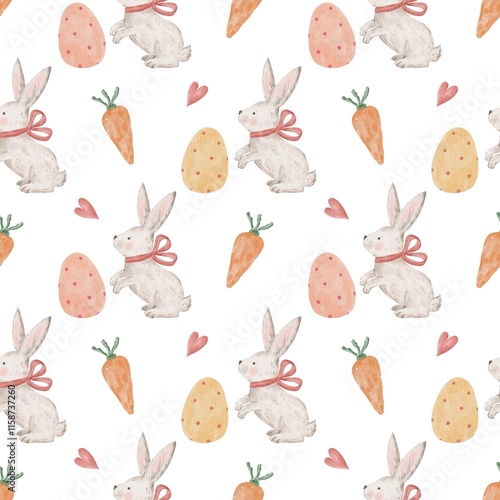 © Alla Dorofieieva, Obraz premium Seamless pattern with cute easter bunny, eggs, carrots. Easter pattern, rabbit fabric design, watercolor illustration. Happy Easter.