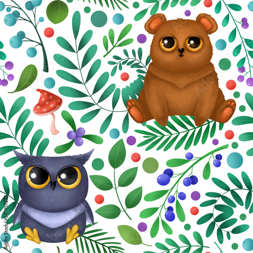 © arkadiwna, Fototapeta premium Seamless pattern with cute forest animals. Children's illustration.