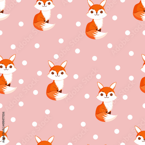 © Irina Anashkevich, Naklejka premium Seamless pattern with cute fox and decorative polka dots. Texture with animals for textiles, wallpaper or print design. Vector illustration.