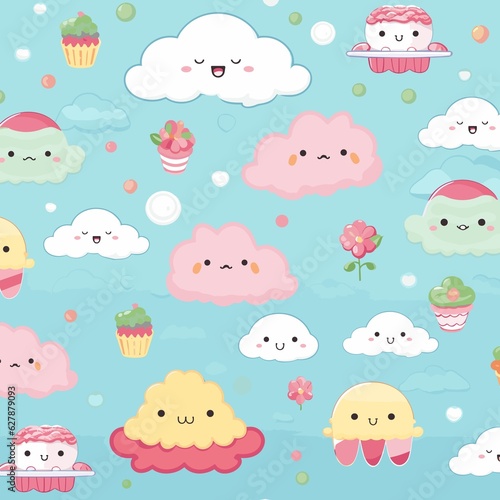 Fototapeta premium Seamless pattern with cute kawaii clouds and cupcakes.Generative AI