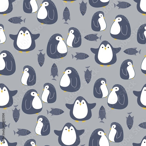 Obraz premium Seamless pattern with cute penguins and fishes. Isolated objects. Vector illustration for fabric, postcards, wallpapers, covers, packaging, wrapping paper.