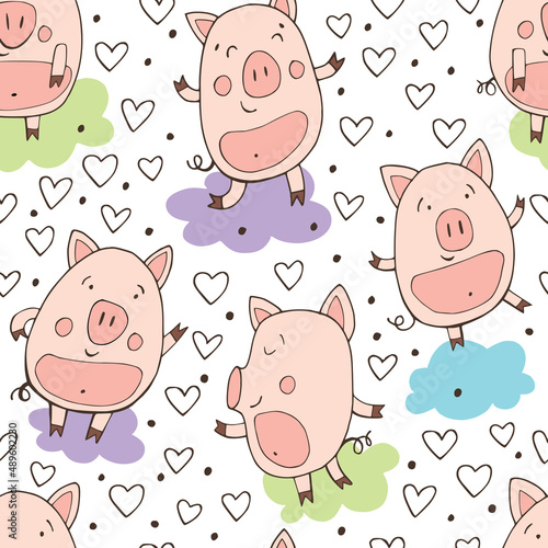 © Elena Melnikova, Obraz premium Seamless pattern with cute pigs.