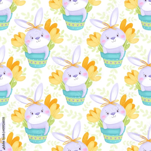 Obraz premium Seamless pattern with cute rabbits and tulips