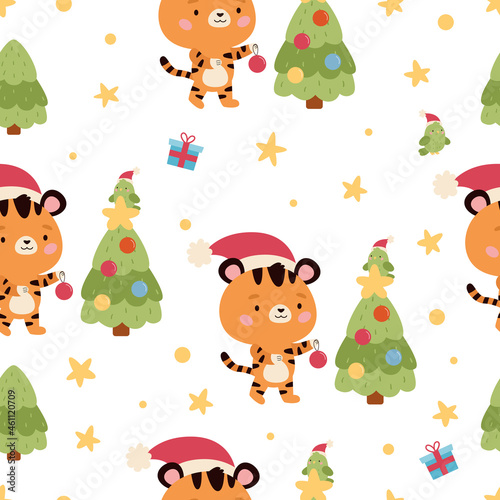 © Kristina, Naklejka premium Seamless pattern with cute tiger, parrot, presents and Christmas tree. Chinese New Year symbol. Cute cartoon characters. Vector illustration.