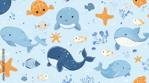 © Sunny, Fototapeta premium Seamless pattern with cute whales, fish, and starfish swimming in the ocean, perfect for children's products or any project related to marine life