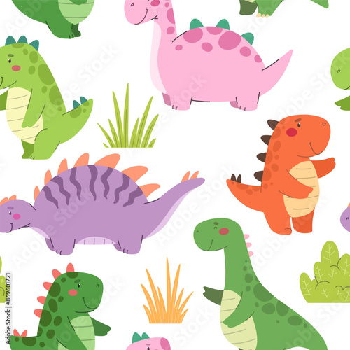© EkaterinaGr, Naklejka premium Seamless pattern with dinosaurs. Cute cartoon dinosaurs, children's print, vector.