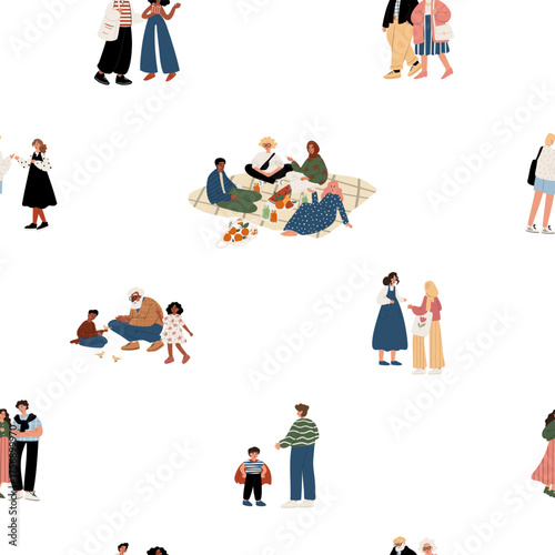 Naklejka premium seamless pattern with diverse people: White, Black, African American, Muslim, adults, seniors, kids, couples. Inclusive and multicultural. Flat vector illustration.