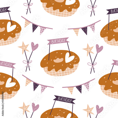Fototapeta premium Seamless pattern with donut in vintage style. Festive modern wallpaper. Vector handmade background