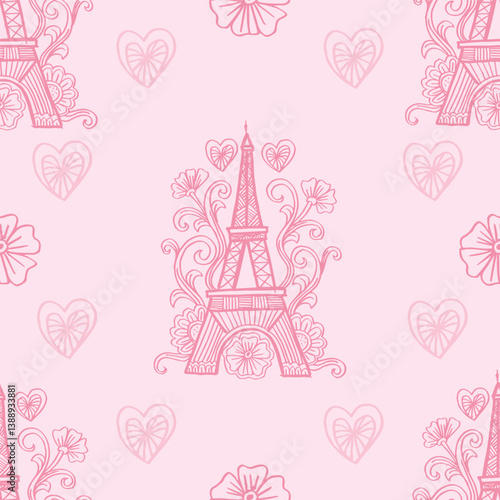 © Handini_Atmodiwiryo, Fototapeta premium Seamless pattern with Eiffel tower and hearts on pink background